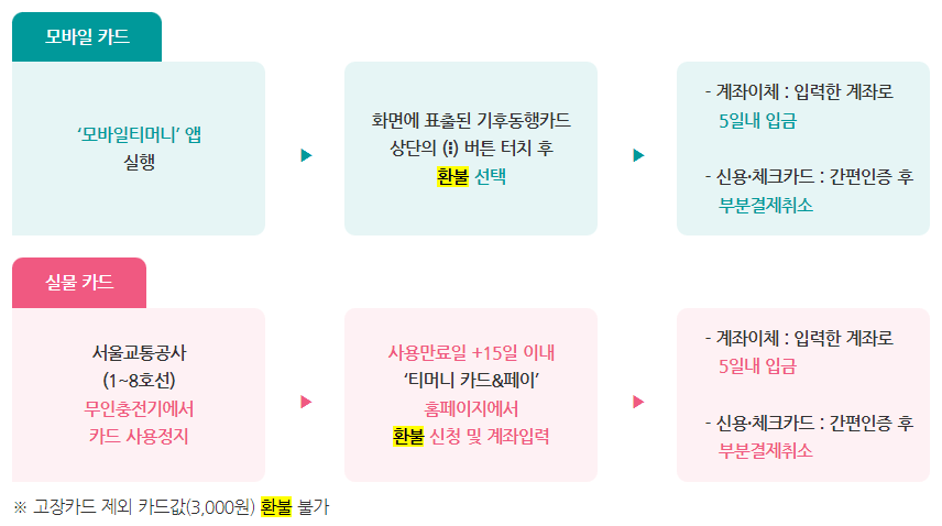 *(예시) : 62,000원 - 28,000원(지하철1,400원 * 20회) - 500원(수수료) : 33,500원 환불 가능