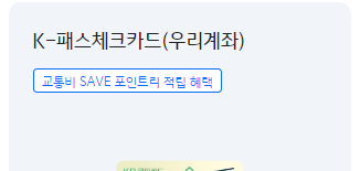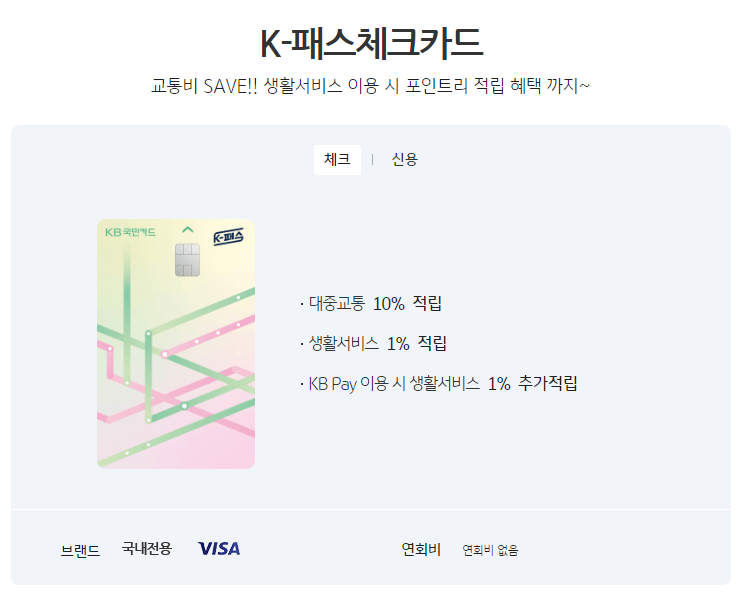 개인적으로 쓰시던 신용카드가 없다면 K패스 국민신용카드를 추천드립니다. K패스 국민체크카드의 경우 KB Pay 포인트 적립으로 이뤄지기 때문에 그게 의미있는 혜택이 아니라고 생각합니다.
